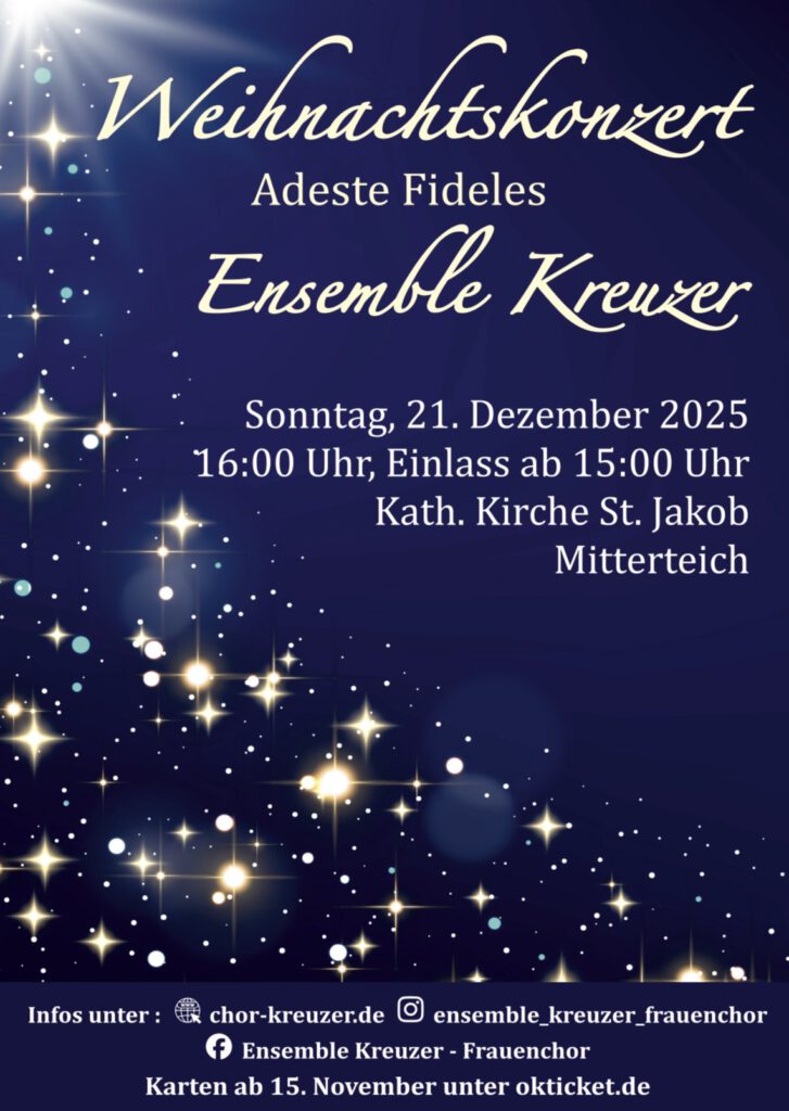 Das Ensemble Kreuzer lädt am 4. Adventssonntag, den 21.12.25 um 16 Uhr, in die Stadtpfarrkirche St. Jakob in Mitterteich zum traditionellen Weihnachtskonzert ein.